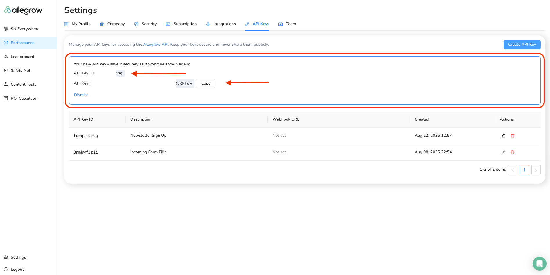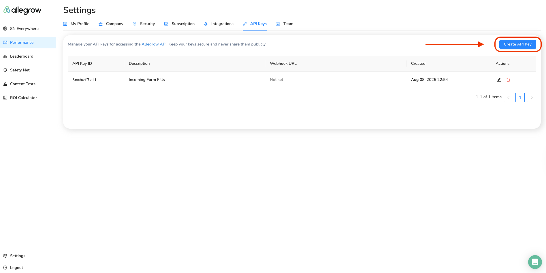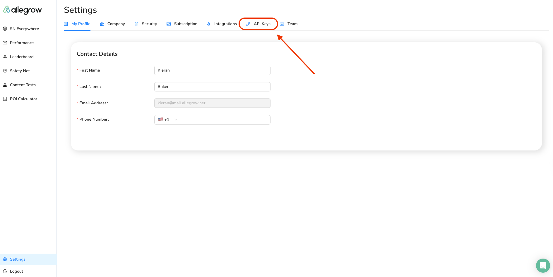 Once you account manager confirms your access to Allegrow's API, you can generate API Keys directly from your account by following the guidance below.